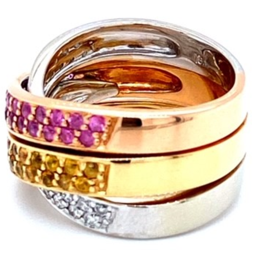 Big wide criss cross band is composed of a yellow gold band with pave' set yellow sapphires, a rose gold band pave' set with pink sapphires & a white gold band underneath that crosses the 2 sapphire bands. Width at the sides is just at .5 of an inch. The ring has a lot of gold to it at a whopping 14.8 grams of 18k. The ring is size 7.25 Genuine Gemstones & Diamonds18k 3-Color GoldSize 7.25