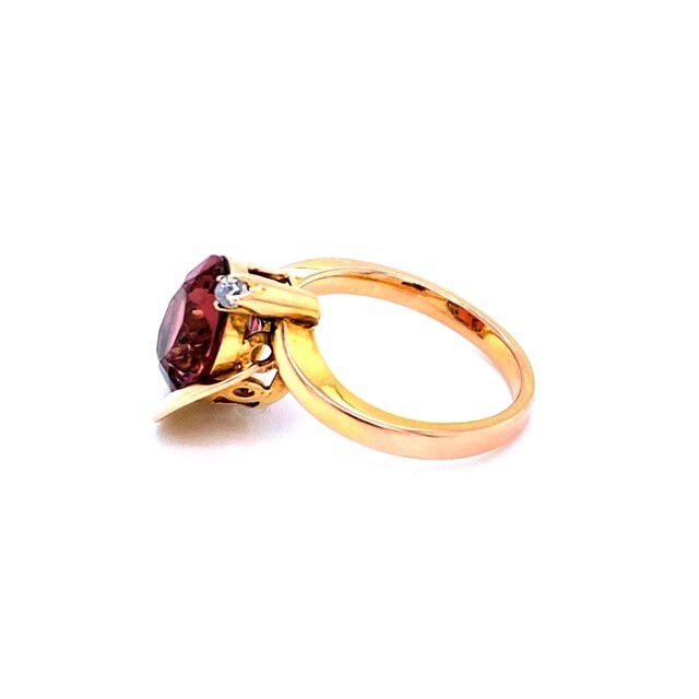 18k, yellow gold ring holds a single, oval brilliant cut tourmaline. The stone is transparent with a strong saturation of rose pink color. The tourmaline weighs approximately 3 carats and has 2 diamond accent stones with a combined weight of .08 of a carat. Undergallery has a raised shoulder and pierced design. Weight of the piece is 4.3 grams and the ring is size 6.25.Genuine Gemstone & Diamonds18k, Yellow GoldSize 6.25