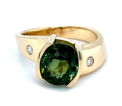 The 14k, yellow gold ring is half bezel set, single oval brilliant cut tourmaline weighs 3.54 carats, is transparent with a saturation of yellow green color. The ring has 2, flush set, round brilliant cut diamonds that have a combined weight of approximately .10 of a carat. The clarity of the diamonds is VS2 and the color range is G-H. The weight of the ring is 8.3 grams and the ring is size 6.25.Genuine Gemstone & Diamonds14k, Yellow GoldSize 6.25
