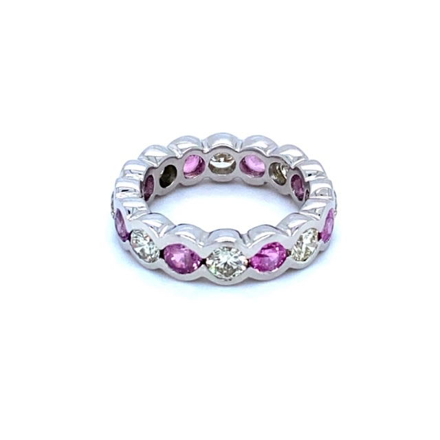 Heavy platinum band holds alternating round brilliant cut sapphires and diamonds.The stones are all half bezel set with lots of metal for durability. The combined weight of the sapphires is approximately 2.00 carats. The sapphires are transparent with a strong saturation of pink color. The combined weight of the diamonds is also about 2.00 carats. The diamonds are VS2 average clarity and the color range is K-L. Width is just at 1/4 inch and about 1/8 inch thick. Weight of the piece is 10.9 grams and the ring is size 7.5.Genuine Gemstones & DiamondsPlatinumSize 7.5