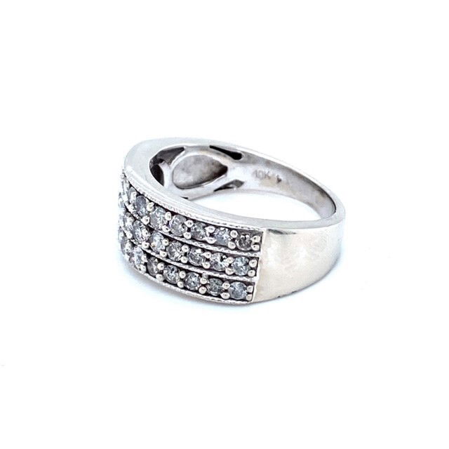Great look for the money! 3 rows of genuine diamonds in this 10k, white gold band. The diamonds are I1 average clarity and I-J in color but the look is fab! Combined weight of the diamonds is approximately .75 of a carat. Lively stones not hazy & milgrained edges on the band. Width at front is just over 5/16 of an inch. The weight of the piece is 5.6 grams and the ring is size 7 . Genuine Diamonds10k, White GoldSize 7Thankyou for taking a look at our jewelry!