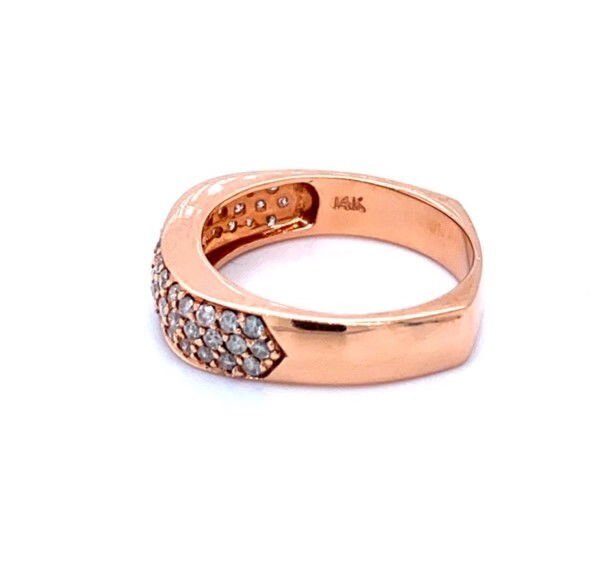 Squared, 14k, rose gold band is pave' set with round brilliant cut diamond along the front and sides. The combined weight of the diamonds is approximately 1.00 carat. The clarity is I1 and the color range is G-H. Width of the band at the front is 1/4 inch. The weight is 7.8 grams and the size is 10.25Genuine Diamonds14k, Rose GoldSize 10.25