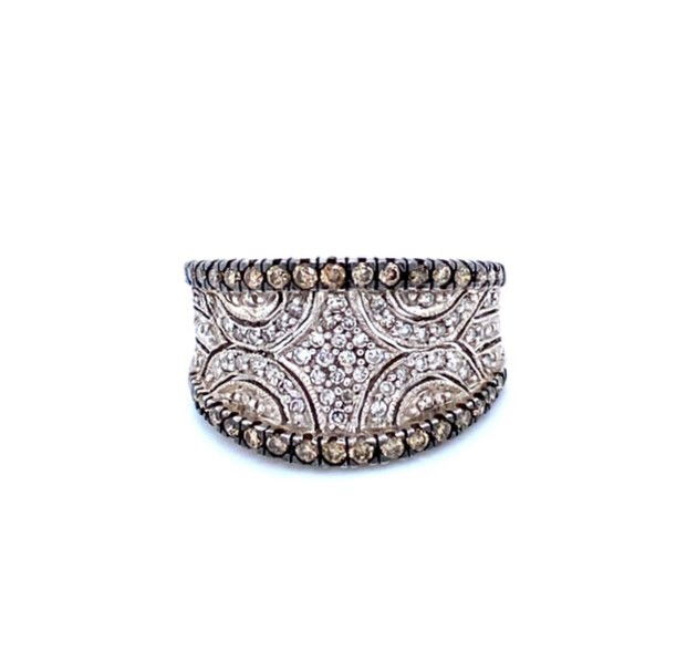 14k, white gold, flared band is set with single round cut, white diamonds in a pierced design with borders of chocolate, round brilliant cut diamonds. The combined weight of the diamonds is approximately .65 of a carat. Average clarity of the diamonds is SI1-2. Width at the front of the band is just over 1/2 inch. Weight of the piece is 6.2 grams and it is size 6.25.Genuine Diamonds14k, White GoldSize 6.25
