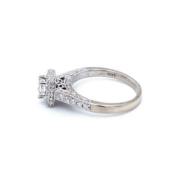 14k, white gold halo ring set with a single, princess cut diamond. The diamond weighs approximately .25 of a carat, is SI2 in clarity and I-J color. The ring has accent, SI2 diamonds with a combined weight of .25 of a carat. The weight of the ring is 3.6 grams and the size is 5.75