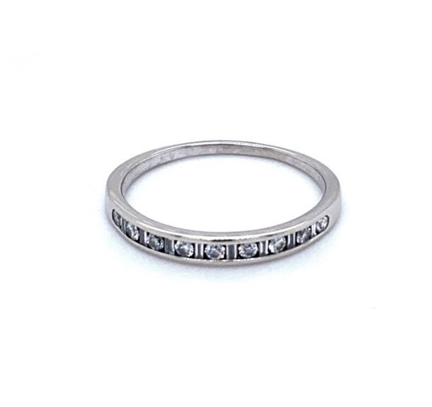14k, white gold band is channel set with alternating straight baguette and round brilliant cut diamonds. The combined weight of the diamonds is approximately .40 of a carat. The average clarity of the diamonds is SI2 and the color range is F-G. Weight of the 2.7 mm wide band is 2.1 grams and is size 9.Genuine Diamonds14k, White GoldSize 9