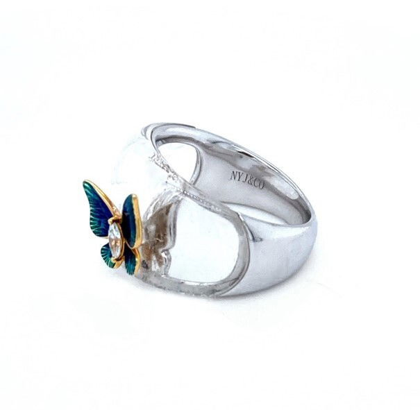 18k, white gold ring has a rock crystal front with a reverse carved butterfly motif. The ring is topped with an 18k, yellow gold butterfly. The butterfly is set with a single, marquise shaped, diamond that weighs .07 of a carat, is VS2 in color and the color is G-H. The butterfly is enameled in blue to green. The width across the front of the ring is just over .50 of an inch. Weight of the piece is 8.6 grams and it is size 6.5.Genuine Diamond18k, White & Yellow GoldSize 6.5
