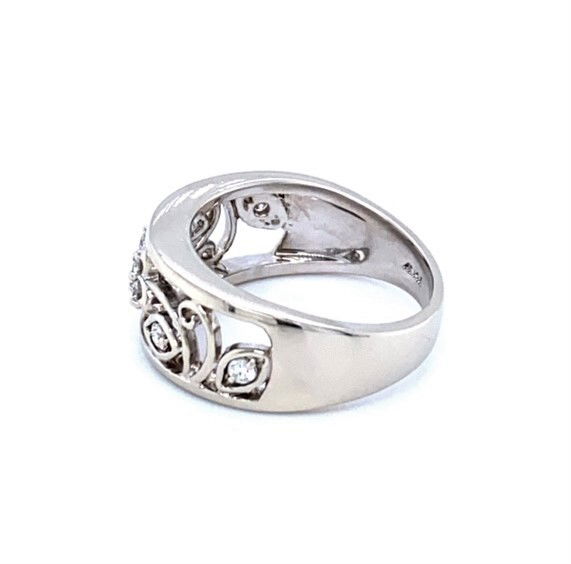 14k, white gold band has an openwork, floral motif and is set with diamonds. The combined weight of the diamonds is .36 of a carat. The average clarity of the diamonds is VS2 and the color range is G-H. Width at the front of the band is 3/8 of an inch. Weight of the piece is 6.4 grams and the size is 7.
