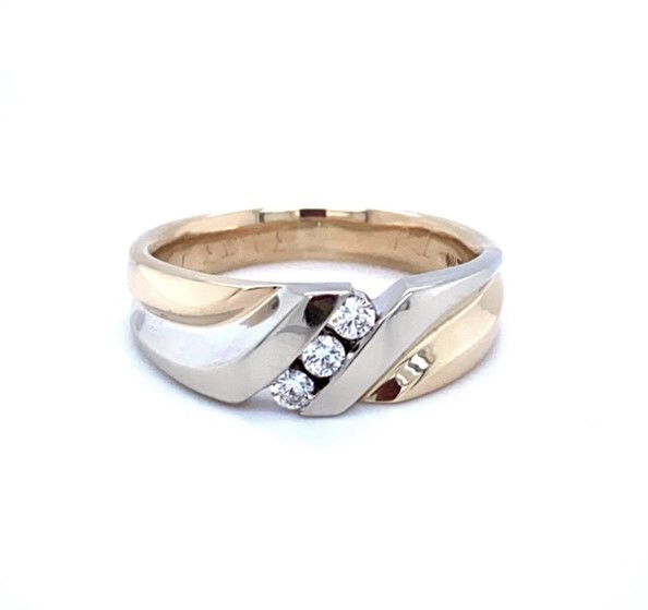 14k, yellow gold band with white gold twist is diagonally channel set with 3, round brilliant cut diamonds. The combined weight of the diamonds is approximately .15 of a carat. The average clarity is VS2 and the color range is H-I. Width at the front of the band is 5/16 of an inch. Weight of the piece is 10.3 grams and it is size 11.5.Genuine Diamonds14k, Yellow & White GoldSize 11.5