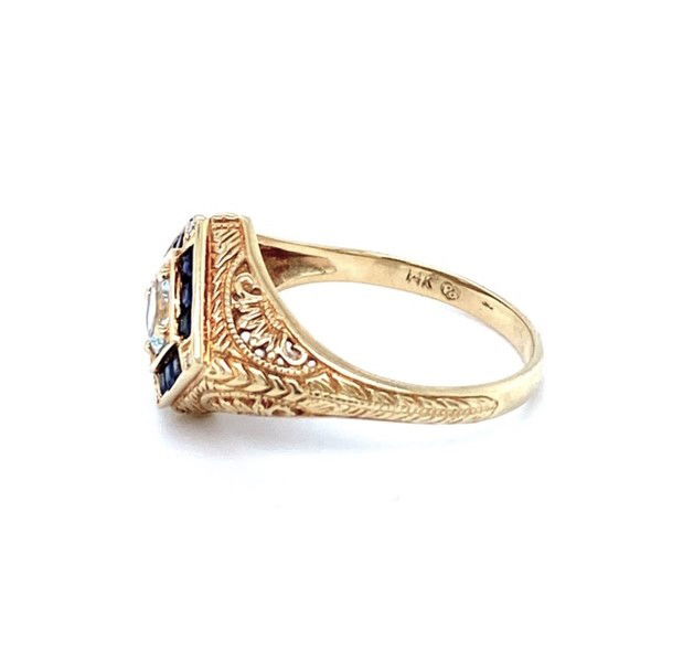 14k, yellow gold filigree ring holds a central, round brilliant cut, aquamarine. The 5.3 mm aquamarine is transparent with a light saturation of icy blue color. The weight of the aquamarine is approximately .35 of a carat. The aquamarine is framed with square cut sapphires with diamond accents. The combined weight of the sapphires is estimated to be .50 of a carat & the diamond accents have a combined weight of .02 of a carat. Width at the front of the ring is 1/2 inch. Weight of the piece is 4.2 grams and it is size 9.Genuine Gemstones & Diamonds14k, Yellow Gold Size 9