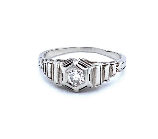 Art Deco, 18k, white gold ring is bead set into a hexagonal setting with step sides. The weight of the diamond is .18 of a carat, is VS2 in clarity and G-H in color. Weight of the piece is 2.6 grams and it is size 7.25.Art DecoGenuine Diamond18k, White GoldSize 7.25