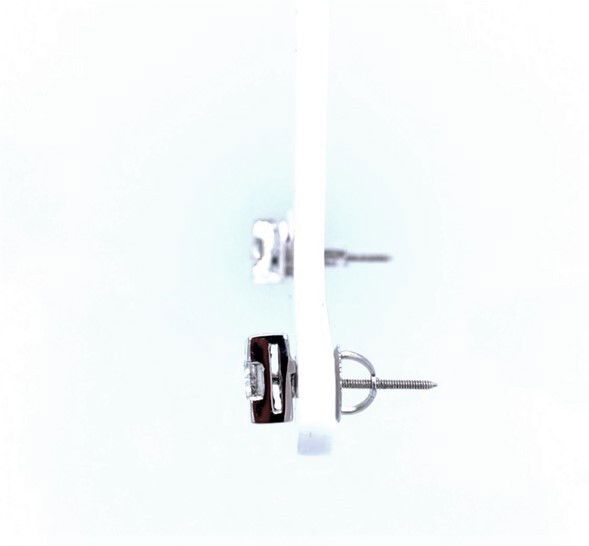 14k, white gold stud earrings are set with trilliant cut diamonds. The combined weight of the diamonds is approximately .75 of a carat. The average clarity of the diamonds is SI1 and the color range is F-G. Width of each stud is 1/4 of an inch. Weight of the pair is 1.3 grams. Screwback posts & backs.Genuine Diamonds14k, White Gold1/4 of an Inch in Length