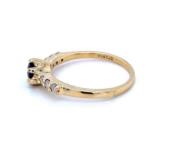 14k, yellow gold ring is set with a single, round brilliant cut sapphire. The 5mm sapphire weighs approximately .50 of a carat. The sapphire is transparent with a strong saturation of dark blue color. The sapphire is accented with 6, round brilliant cut diamonds. The average clarity of the diamonds is SI2 and the color range is G-H. The weight of the ring 2.6 grams and it is size 7.Genuine Gemstone & Diamonds14k, Yellow GoldSize 7