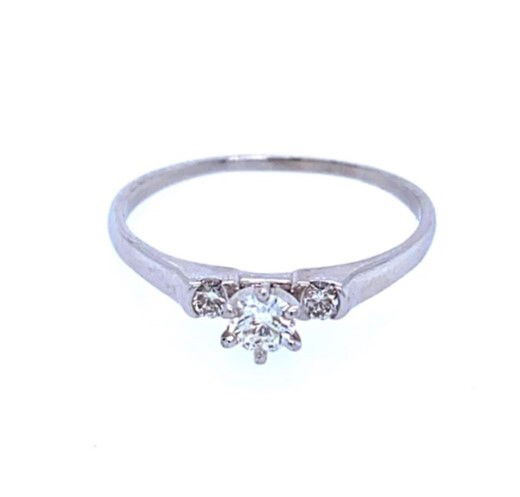 14k, white gold band is set with a round brilliant cut diamond in the center. The diamond weighs approximately .28 of a carat, is SI1 in clarity and H in color. The diamond is flanked by 2, small diamond accents that have a combined weight of .12 of a carat and are the same clarity and H-I in color. Weight of the piece is 2 grams and it is size 10.Genuine Diamonds14k, White Gold Size 10