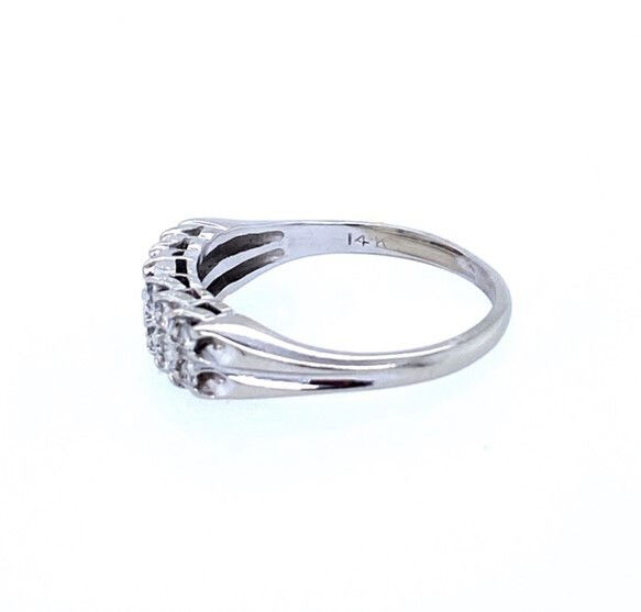 14k, white gold band has a double row of single round cut diamonds. The combined weight of the diamonds is approximately .28 of a carat. The average clarity of the stones is SI1 and the color range is G-H. Width at the front is 5.2 mm and the weight is 2.8 grams. Ring size is 6.5.Genuine Diamonds14k, White GoldSize 6.5