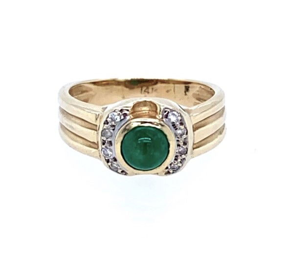 14k, yellow gold ring bezel set with a single, emerald cabochon. The 5.3 mm cabochon weighs approximately .75 of a carat, is opaque with a strong saturation of green color. The emerald is accented with 8, round brilliant cut diamonds that have a combined weight of .08 of a carat, are SI2 average clarity and H-I in color. The band is ribbed and the weight of the ring is 4.1 grams. Size is 7.5.Genuine Gemstone & Diamonds14k, Yellow GoldSize 7.5