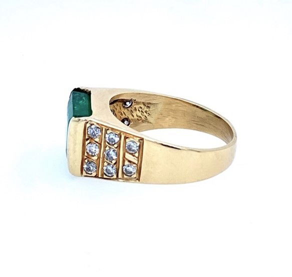 14k, yellow gold ring is channel set with a single, emerald cut, natural emerald. The weight of the 11 x 9 mm emerald is approximately 3.50 carats. The stone is semi transparent with a strong saturation of green color. The emerald is accented with round brilliant cut diamonds that are bead set along the sides. The combined weight of the diamonds is estimated to be .50 of a carat, with an average clarity of SI1 and a color range of F-G. The ring weighs 6.3 grams and is size 7.25.Genuine Gemstone & Diamonds14k, Yellow GoldSize 7.25