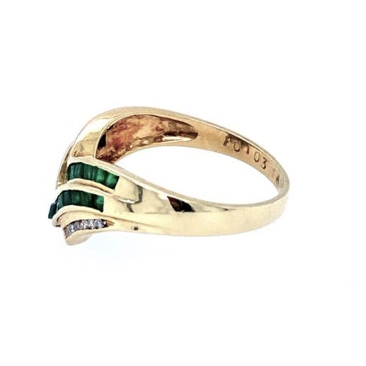 18k, yellow gold, cheveron ring is channel set with double rows square cut emeralds accented with a bottom channel set row of round brilliant cut diamonds. The combined weight of the emeralds is approximately .50 of a carat.The stones are semi-transparent with a strong saturation of green color. The combined weight of the diamonds is approxiamately .06 of a carat. The average clarity of the diamonds is SI2 and the color range is G-H. Weight of the ring is 3.6 grams and the ring is size 7.25.Genuine Gemstones & Diamonds18k, Yellow GoldSize 7.25