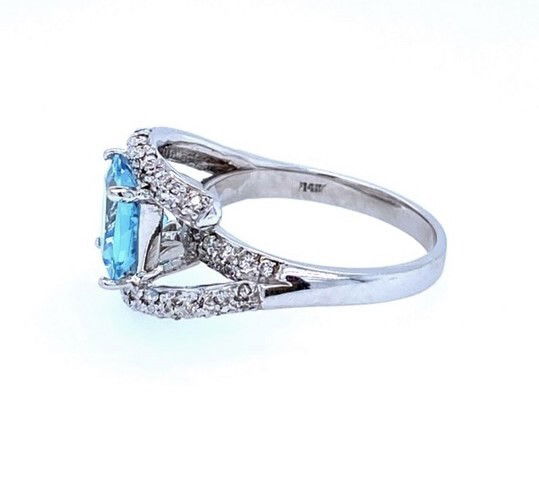 14k, white gold bypass ring with a single, cushion cut, aquamarine. The stone weighs approximately 2.10 carats, is transparent with a medium saturation of light blue color. The ring is accented by bead set diamonds along the front. The combined weight of the diamonds is estimated to be .40 of a carat. The average clarity is SI2 and the color range is G-H. Width at the front is just over 1/2 inch. Weight of ring is 6.3 grams & it is size 8.Genuine Gemstone & Diamonds14k, White GoldSize 8