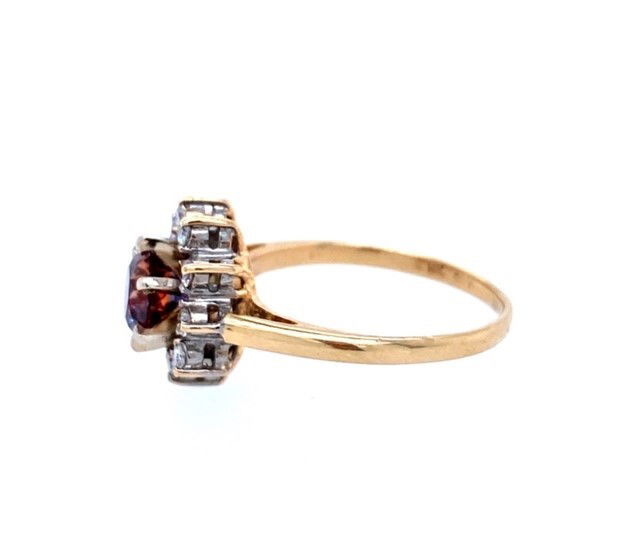 14k, yellow gold ring is set with a single, 6 mm, round brilliant cut Montana sapphire. The untreated sapphire, weighs approximately 1 carat, is transparent with a strong color change from purplish red to blue. The sapphire is accented with round brilliant cut diamonds that have an estimated, combined weight of .20 of a carat. The average clarity of the diamonds is SI2 and the color range is F-G. The width at the front of the ring is 1/2 inch. Weight of the ring is 2.8 grams and it is size 5.5. All stones are set in white gold. Genuine Untreated Montana Color Change SapphireGenuine Diamonds14k, Yellow & White GoldSize 5.5