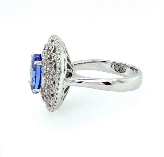 14k, white gold ring has a heavy weigh, tapered band and is set with a single, oval brilliant cut, tanzanite. The tanzanite weighs approximately 3.95 carats, is transparent with a strong saturation of violet purple color. The tanzanite is set into a pierced and filigreed frame set throughout with diamonds. The combined weight of the diamonds is estimated to be .72 of a carat with an average clarity of SI2-I1 and a color range of H-J. Length at the front of the ring is 7/8 of an inch. Weight of the ring is 9.4 grams and it is size 7.25.Genuine Gemstone & Diamonds14k, White GoldSize 7.25