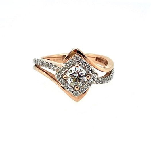 14k, rose and white gold ring holds a central, round brilliant cut diamond. The diamond weighs approximately .50 of a carat, is SI1 in clarity and J-K in color. The ring is accented with a diamond halo and extend down the band. The combined weight of the side diamonds is estimated to be .34 tcw. Length at the front of the ring is just over 1/2 of an inch. Weight of the ring is 4.6 grams and it is size 7.25.Genuine Diamonds14k, Rose & White GoldSize 7.25