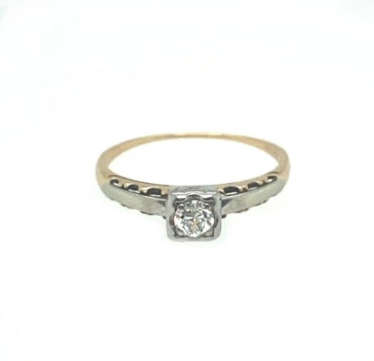 Vintage, 14k, yellow and white gold ring is set with a single, Old European cut diamond. The diamond weighs approximately .15 of a carat. The clarity of the diamond is VS2 and the color is G-H. The ring weighs 1.7 grams and is size 7.Genuine Diamond14k, Yellow & White GoldSize 7