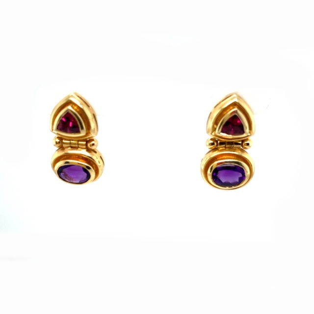 14k, yellow gold earrings are bezel set with buff topped, trilliant tourmalines. The combined weight of the tourmalines is over 1 carat. They are transparent, with a strong saturation of rose pink color. The bottoms of the earrings are bezel set with horizontally set, buff topped, oval amethysts. The combined weight of the amethysts is approximately 4.25 carats. The stones are transparent with a strong saturation of dark purple color. length of the earrings is just under 1 inch and the weight of the pair is 8.8 grams. 14k posts & friction backs. Genuine Gemstones14k, Yellow Gold1 Inch