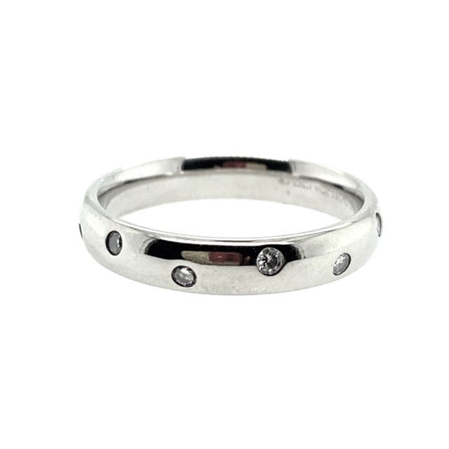 14k, white gold, 4mm, comfort fit band is flush set with 12, round brilliant cut diamonds. The estimated combined weight of the diamonds is .25 of a carat. The average clarity is VS2 and the color range is G-H. Weight of the ring is 4.3 grams and it is size 7.75