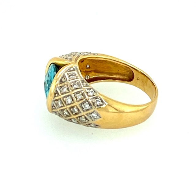 18K, yellow gold bombe' (domed) ring is set with a single, oval, checkerboard cut, blue topaz. The topaz weighs approximately 3.80 carats, is transparent with a medium saturation of light blue color. The ring is accented with bead set, round brilliant cut, diamonds. The combined weight of the diamonds is estimated to be .38 of a carat. The average clarity of the diamonds is VS2 and the color range is G-H. Length at the front of the ring is 1/2 inch. Weight of the piece is 12.1 grams and it is size 9.Genuine Gemstone & Diamonds18k, Yellow Gold Size 9