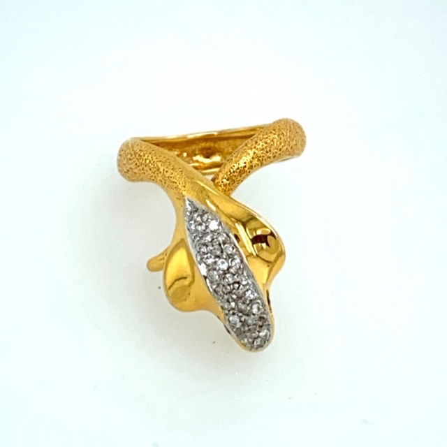 18k, yellow gold cobra ring has texturing along the body with a polished head bead set with round brilliant cut diamonds down the center, in white gold. The combined weight of the diamonds is approximately .32 of a carat. The average clarity is SI2 and the color range is G-H. The eyes are set with rubies that have an estimated combined weight of .10 of a carat. The rubies are transparent with a strong saturation of red color. The head extends about 1/2 inch from the band. The weight of the ring is 8.4 grams and it is size 7.Genuine Diamonds & Gemstones18k Yellow & White GoldSize 7