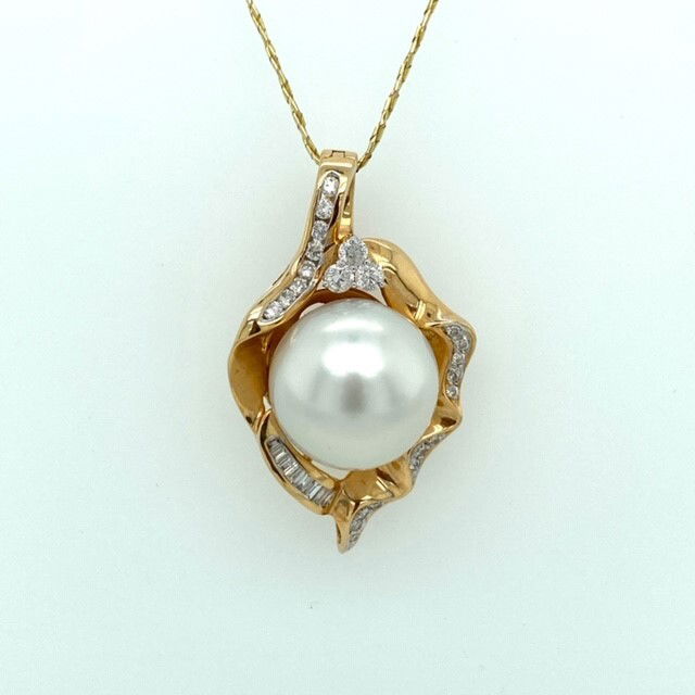 14k, yellow gold pendant enhancer is set with a single, south sea pearl. The pearl measures 14.6 mm, has a silvery white body color and has very good surface and luster. The piece is accented with baguette and round brilliant cut diamonds. The combined weight of the diamonds is approximately .50 of a carat. The average clarity of the diamonds is SI2 and the color range is F-G. Length of the pendant is just under 1 1/2 inches including bail and it will accommodate up to a 6.5mm thick chain or a strand. Weight of the piece is 10.8 grams. Genuine Gemstone & Diamonds14k, Yellow Gold1 1/2 Inches in Length