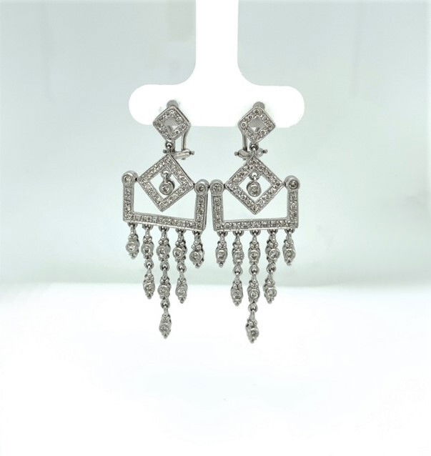 14k, white gold, chandelier earrings in an Art Deco motif. The earrings are set with round brilliant cut diamonds throughout. The combined weight of the diamonds is approximately 1 carat. The average clarity is VS2 and the color range is I-J. The earrings have posts and omega backs for added security. Weight of the pair is 10.3 grams and they are 2 inches in length.Genuine Diamonds14k, White Gold2 Inches in Length