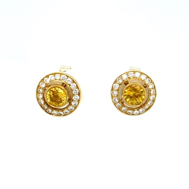 14k, yellow gold stud earrings are each set with a 5.2 mm, round brilliant cut yellow sapphire. The combined weight of the sapphires is approximately 1 carat. The sapphires have diamonds halos with a combined estimated weight of .50 of a carat. The average clarity of the diamonds is SI1 and the color range is F-G. The diameter of each earring is 7/16 of an inch. Weight of the pair is 3.6 grams. Genuine Gemstones & Diamonds14k, Yellow Gold7/16 of an Inch in Diameter