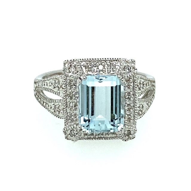 14k, white gold ring set with a single, emerald cut, aquamarine. The approximately 9.3 x 7 mm stone weighs an estimated 2.25 carats, is transparent with a light saturation of pale blue color. The ring is accented with 22, round brilliant cut diamonds. The combined weight of the diamonds is approximately .20 of a carat. The average clarity of the diamonds is SI2 and the color range is H-J. The ring weighs 4.1 grams and it is size 7.25.Genuine Gemstone & Diamonds14k, White GoldSize 7.25