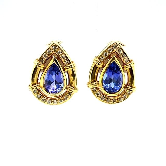 18k, yellow gold earrings are each bezel set with a single, pear shaped, tanzanite. The combined weight of the tanzanites is estimated to be 4.30 carats. The tanzanites are transparent with a medium saturation of violet purple color. The earrings are accented with 30, round brilliant cut diamonds. The combined weight of the diamonds is approximately .30 of a carat. The average clarity of the diamonds is VS2 and the color. The prior owner added 14k omega backs. Length of the earrings is 3/4 of an inch and the weight of the pair is 10.3 grams.Genuine Gemstones & Diamonds18k & 14k, Yellow Gold3/4 of an Inch in Length
