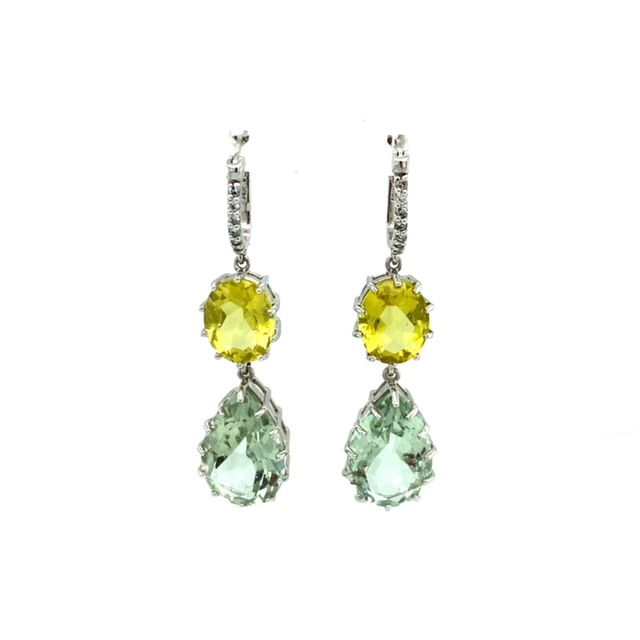 14k, white gold earrings each set with an oval 10 x 8 mm peridot with a pear 15 x 10 mm prasiolite. The combined approximate weight of the peridots is 6 carats and the combined estimated weight of the prasiolites is 9 carats. The tops of the earrings are accented with diamonds that have a combined weight of .10 of a carat with an average clarity of SI2 and a color range of H-I. Length of the earrings is 1 3/4 inches and the weight of the pair is 8 grams. Genuine Gemstones & Diamonds14k, White Gold1 3/4 Inches in Length