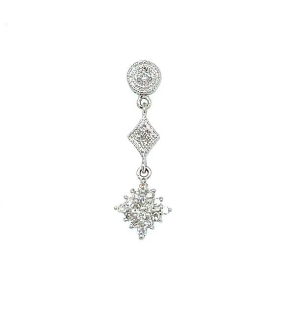 14k, white gold have a round and diamond shaped section each milgrained edged and set with a single round brilliant cut diamond, ending with a diamond shaped cluster of 16 more diamonds. The combined weight of the diamonds is estmated to be .32 of a carat. The average clarity of the diamonds is SI1-2 and the color range is H-I. Length of each earring is 1 1/16 inches. Weight of the pair is 2.4 grams.Genuine Diamonds14k, White Gold1 1/6 Inches in Length