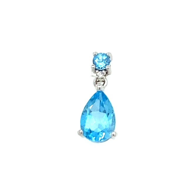 14k, white gold earrings each set with a single , round brilliant and a single pear brilliant cut blue topaz. The combined weight of the 3 mm round and the 9 x 6 mm pear shapes is estimated to be 3 carats. Accented with 2 x .01 carat, single round cut diamond. The average clarity of the diamonds is SI2 H-I in color. Length of each earring is approximately 5/8 of an inch. Weight of the pair is 2.3 grams. Genuine Gemstones & Diamonds14k, Solid White Gold5/8 of an Inch in Length