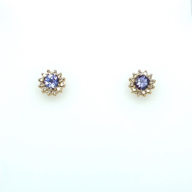 14k, yellow gold. Each earring is set with a single, 5 mm round brilliant cut tanzanite. The combined weight of tanzanites is approximately .50 of a carat. The tanzanites are each surrounded by a halo of diamonds. The combined weight of the diamonds is estimated to be .24 of a carat. The average clarity of the diamonds is SI1-2 and the color range is I-j. The diameter of each earring is just over 1/4 of an inch. Weight is 1.4 grams.Genuine Gemstones & Diamonds14k, Solid Yellow Gold1/4 Inch in Diameter