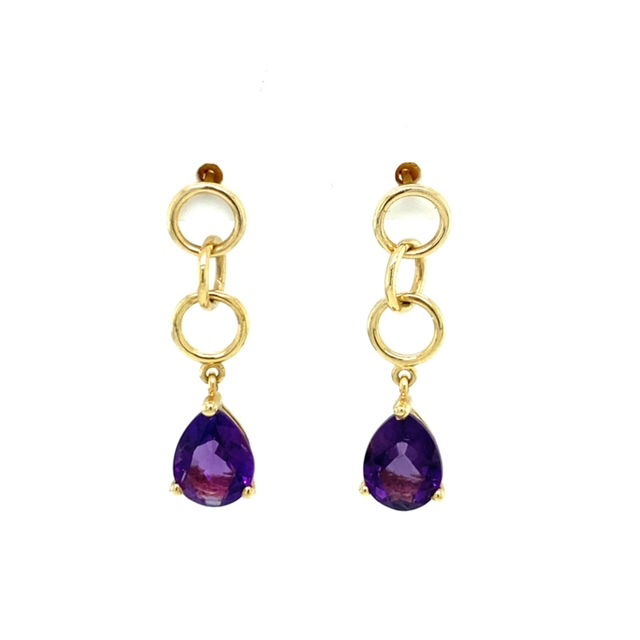 14k, yellow gold dangle earrings are composed of 3 intertwined jump rings with a pear amethyst drop. The combined weight of the amethysts is approximately 2.5 carats. Length of the each earring is 1 1/8 inches. Weight of the pair is 3.2 grams.Genuine Gemstones14k, Yellow Gold1 1/8 Inches in Length