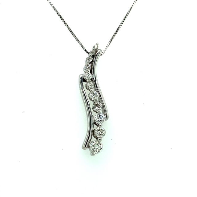 14k, white gold wavy journey pendant set with 11,graduated, round brilliant cut diamonds. Comes with an 18 inch box chain also in 14k, white gold