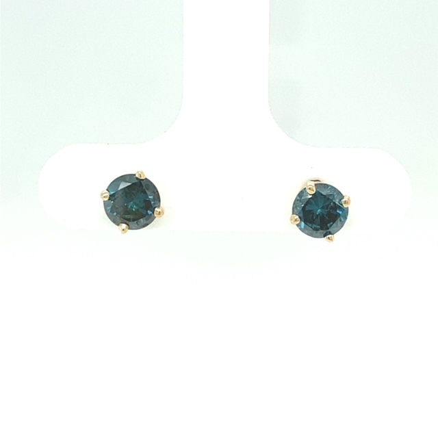 Color treated blue round brilliant cut diamond studs in 14k, yellow gold.