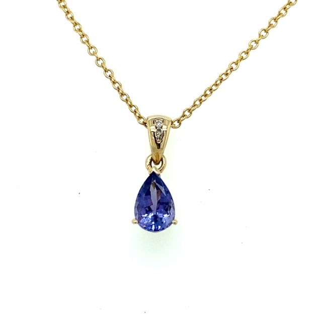 14k, yellow gold, pear tanzanite pendant with diamond accents on chain.