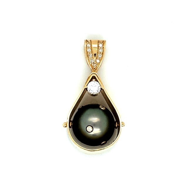 14k, yellow gold teardrop pendant set with a rolling 12.6mm, Tahitian pearl accented with diamonds.