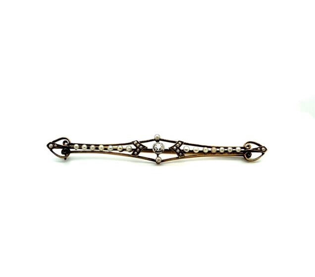 10k, yellow gold, bar pin set with a single, Old European cut diamond, in the center, accented with seed pearls.
