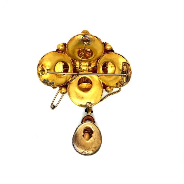 18k, yellow gold pin set with garnets throughout with foliate design & pendant with safety chain