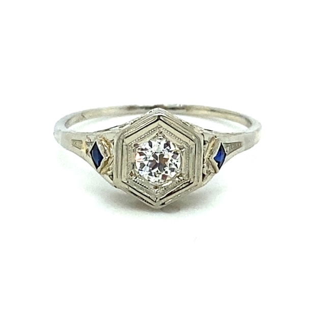 18k, white gold Deco ring with an Old European cut diamond and 2 square sapphires.