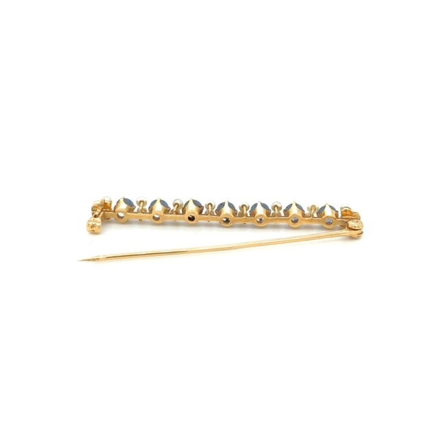 14k, yellow gold bar pin set with sapphires & seed pearls ***Possibly Montana sapphire