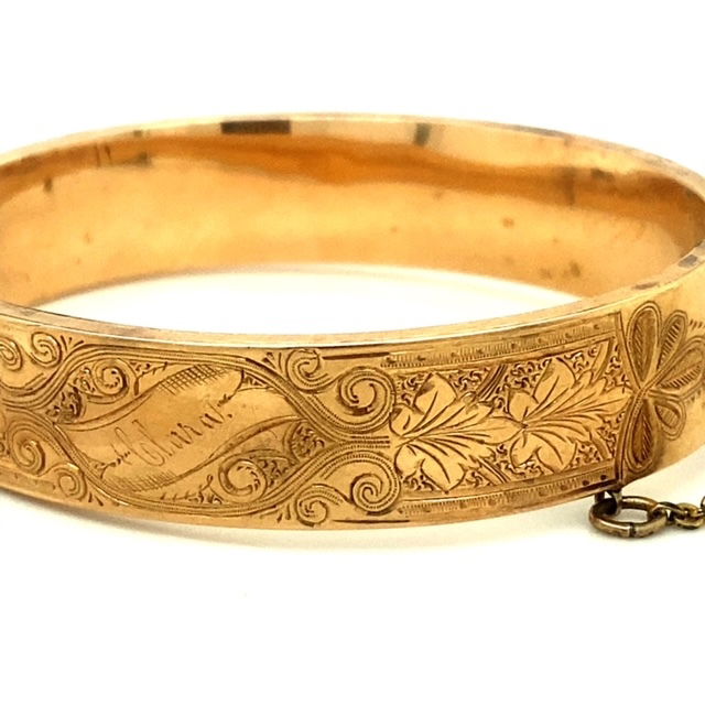 Victorian engraved, hinge bangle in 14k, yellow gold. Engraved Clara on back