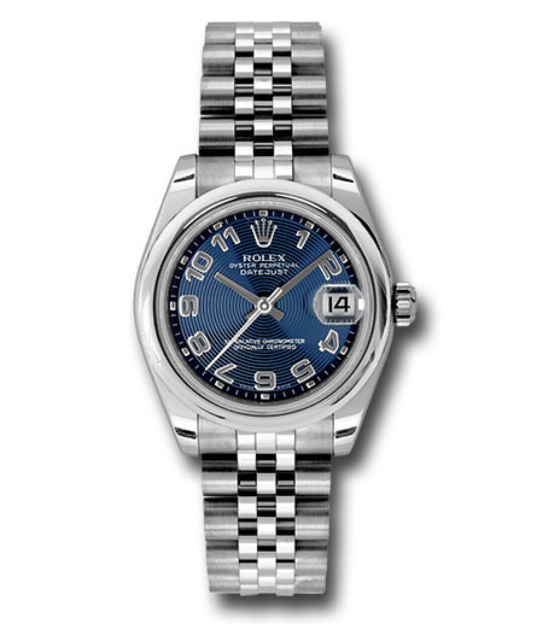 4. Rolex Midsize 31mm stainless steel case, domed bezel, blue concentric circle dial, Arabic numerals, and Jubilee bracelet
